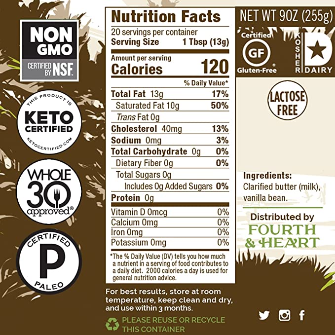 4th & Heart Vanilla Bean Grass-Fed Ghee, 9 Ounce, Keto, Pasture Raised, Lactose and Casein Free, Certified Paleo