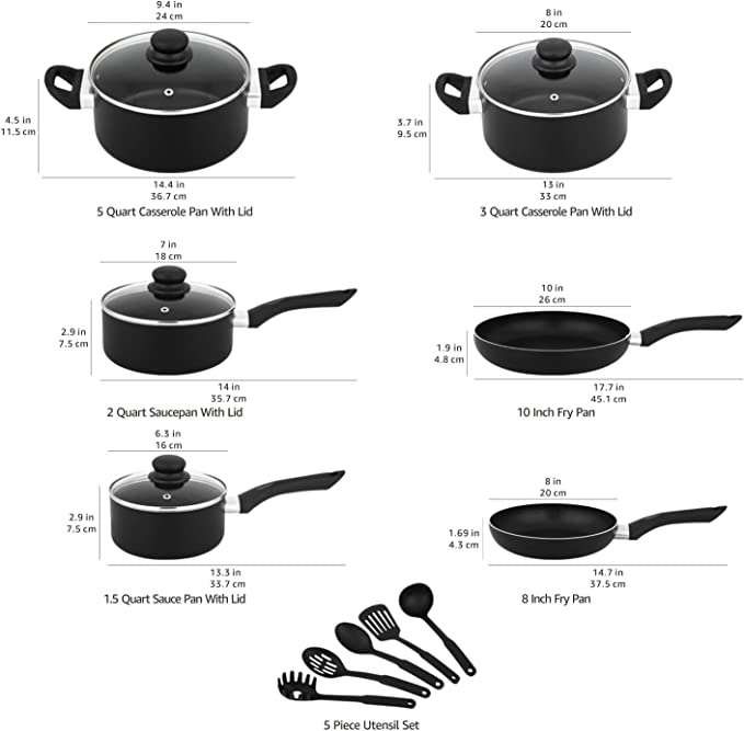 15-piece nonstick cookware set includes 8-inch fry pan, 10-inch fry pan, 1.5 quart saucepan with lid, 2 quart saucepan with lid, 3 quart casserole pan with lid, 5 quart casserole pan with lid, and 5-piece utensil set with pasta server, soup ladle, slotted turner, serving spoon, and slotted serving spoon
